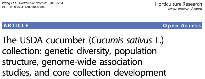 [4] Wang X, Bao K, Reddy UK, et al. The USDA cucumber (Cucumis sativus L.) collection: genetic diversity, population structure, genome-wide association studies, and core collection development. Hortic Res. 2018;5:64.