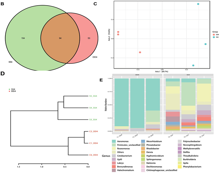 測序樣品:養(yǎng)殖5個月后,隨機各抽取3條魚(饑餓24小時),將腸分為前腸、中腸和后腸段,并用鑷子擠壓將每個片段的內容物收集到無菌的2ml收集管中(DD4指對照組樣本,SS4指實驗組樣本)。對應的同一樣本腸道組織用于轉錄組測序(CT指對照組樣本,ST指實驗組樣本)。
