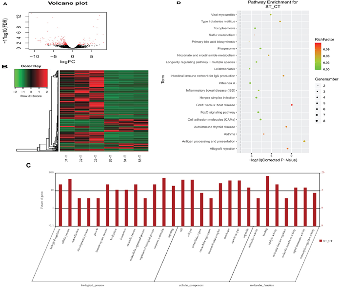 使用與16S測序相同的樣本對黃河鯉新品種(實驗組)和對照組中的轉錄組進行測序并鑒定差異基因(DEG)。在249個顯著DEGs中(如圖3A),194個基因表達下調,55個基因表達上調。通過GO注釋,這些基因被分為以下功能類別:生物調節(jié)、細胞過程、解毒作用、發(fā)育過程、免疫系統進程等(都屬于生物過程);細胞、細胞部分、胞外區(qū)域、胞外區(qū)域部分、大分子復合物等(細胞成分);抗氧化活性、結合活性、催化活性、分子功能調節(jié)器上等(分子功能)。聚類分析表明,實驗組和對照組具有不同的特征,DEG分為四個部分(圖3B)。這些基因的GO注釋包括生物學過程中的13個類別,細胞成分中的8類和分子功能類別中的7類(圖3C)。KEGG注釋將這些基因中的大部分分配到免疫相關途徑(圖3D)。
