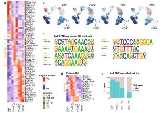 作為獨立驗證,首先從pro-B細胞中檢索了大量ATAC-seq數(shù)據(jù),顯著富集的TF motif證實了與pro-B G1期細胞相關(guān)的9個TF(EBF1、FOXO1、TCF3、RFX5、IRF1、TCF4、LEF1、ERG、FLI1)(圖 2c)。pro-B活性TF在兒童BM數(shù)據(jù)集中也具有高度相似的活性譜(圖 2d)。接下來,分析了包括TF與目標(biāo)基因表達相關(guān)性,以及每個目標(biāo)基因位點的TF motif。根據(jù)發(fā)現(xiàn)集中找到的TF,在訓(xùn)練/測試集中預(yù)測它們的靶基因。為了測試預(yù)測的靶基因是否受TF調(diào)控,本研究檢索了PAX5、EBF1和BCL11A的ChIP-seq數(shù)據(jù),這些數(shù)據(jù)在人類細胞系模型 Nalm-6中可用,使用GREA T獲得與基因關(guān)聯(lián)的peak。對于PAX5和EBF1,超過75%的預(yù)測目標(biāo)具有ChIP-seq peak關(guān)聯(lián)(圖 2e)。ATAC-seq motif富集與基于ChIP-seq的TF靶基因位點驗證,結(jié)果高度一致,證明TF活性評分反映了調(diào)節(jié)作用。說明本研究對健康人BM單細胞轉(zhuǎn)錄組的分析為基因表達和TF活性變化提供了全面的參考,這些變化表征了單細胞分辨率下早期B細胞譜系分化的特征。