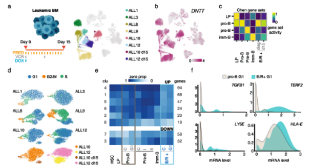 為了表征ALL(E/R)中常見的TF融合的白血病細胞,本研究對6個兒童E/R+ pre-B-ALL病例進行了scRNA-seq,收集6個診斷期和2個誘導(dǎo)化療第15天的BM樣本(圖 3a)。基于DNTT表達及其與正常BM細胞類型的明確分離,確定了每個供體中的白血病細胞簇(圖 3b)。基于B細胞譜系簇特異性基因集,發(fā)現(xiàn)診斷時白血病母細胞類似于pro-B分化狀態(tài)(圖 3c)。該分析同樣將pro-B細胞鑒定為*接近的正常分化狀態(tài),這與之前的研究一致。細胞周期狀態(tài)在不同情況下不同,ALL3中的循環(huán)細胞比例*低,ALL9中的*高比例(圖 3d)。對于具有中期誘導(dǎo)治療的2個病例(ALL10 和 ALL12),在第15天收集的樣本中細胞分離為不同的細胞狀態(tài)(圖 3a、d),表明治療進一步改變了白血病細胞狀態(tài)。