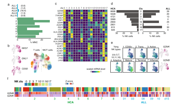為了進一步表征免疫細胞群,將HCA和E/R+ ALL供體的T細胞和NK細胞匯集在一起進行聯(lián)合分析。基于聚類和marker基因分析,可以區(qū)分幾種不同的NK細胞類型(圖 4b、c)。篩選表達GNLY或NKG7的cluster(cluster 0、2、3、7、10、11、16),發(fā)現(xiàn)與來自HCA供體的NK細胞相比,來自ALL BM的NK細胞被隨機分配給這些cluster(圖 4d)。具體來說,所有NK細胞主要代表cluster 10和16,它們與表達未成熟CD56bright 和過渡NK細胞的顆粒酶 K(GZMK)相匹配(圖 4e 中的基因組評分代表來自scRNA-seq研究的NK亞型)。相比之下,大多數(shù)正常 BM NK細胞代表表達顆粒酶 B(GZMB)和穿孔素(PRF1)的成熟或終末NK細胞(cluster 0)。因此,E/R+白血病細胞可能會主動逃避NK細胞的細胞毒性,然而,NK類型的頻率因供體而異(圖 4f)。高表達IFNG的cluster 7幾乎完全對應(yīng)于HCA供體 3,而與其他ALL病例相比,細胞周期高度活躍的ALL8和ALL9更類似于正常BM中的成熟或活性NK細胞譜??傊?,白血病細胞狀態(tài)與正常pro-B分化狀態(tài)的不同之處在于干/祖細胞特異性基因和幾種免疫調(diào)節(jié)基因的高表達。免疫調(diào)節(jié)基因的變化反映為E/R+ BM內(nèi)更多不成熟的NK細胞類型。