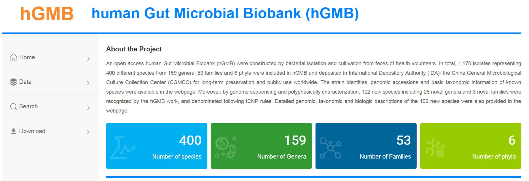 2021年5月,中科院微生物所通過從健康志愿者糞便中分離培養(yǎng)細(xì)菌,構(gòu)建了一個(gè)開放獲取的人類腸道微生物庫(hGMB)。數(shù)據(jù)庫共有1170個(gè)菌株,代表6門53科159屬400個(gè)不同物種。并保存在國際保存機(jī)構(gòu)(IDA)-中國微生物培養(yǎng)總收集中心(CGMCC),以便在全球范圍內(nèi)長期保存和公共使用。該網(wǎng)站提供了已知物種的菌株身份、基因組材料和基本分類信息。根據(jù)國際原核生物命名規(guī)則,對102個(gè)新種進(jìn)行了特征描述和命名,提出了28個(gè)新屬和3個(gè)新科。hGMB代表了全球人類腸道16S rRNA基因擴(kuò)增子數(shù)據(jù)(n=11647)中80%以上的常見和優(yōu)勢人類腸道微生物屬和種。