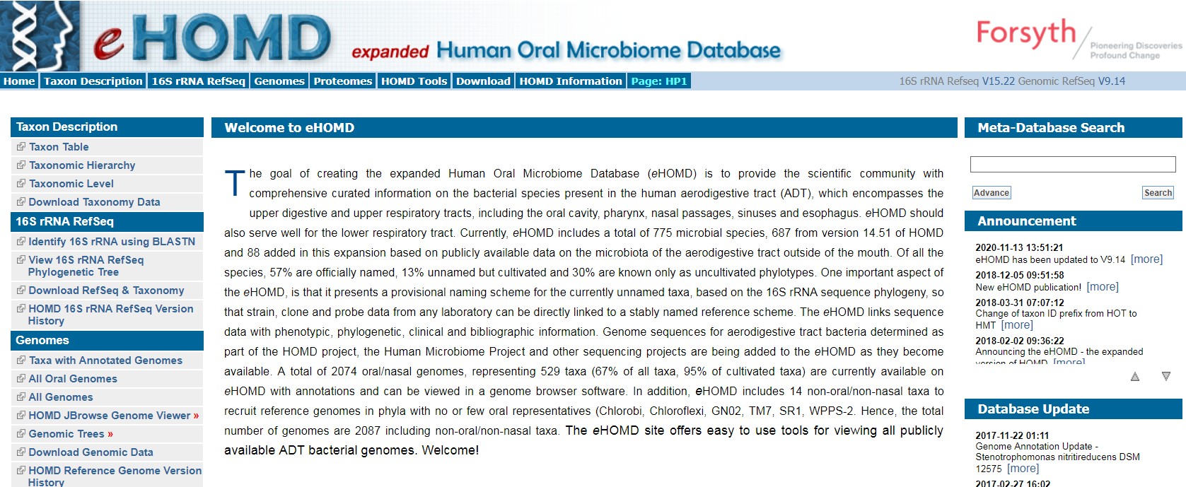 目前,eHOMD共包括775種微生物,其中687種來自HOMD 14.51版,88種是根據(jù)口外空氣消化道微生物群的公開可用數(shù)據(jù)在本次擴(kuò)展中添加的。在所有物種中,57%是正式命名的,13%是未命名的(但可人工培養(yǎng)),30%是無人工培養(yǎng)型。eHOMD將序列數(shù)據(jù)與表型、系統(tǒng)發(fā)育、臨床和文獻(xiàn)信息聯(lián)系起來,共有2074個(gè)口腔/鼻腔基因組,代表529個(gè)分類群(占所有分類群的67%,占培養(yǎng)分類群的95%)。目前可在eHOMD上獲得,并帶有注釋,可在基因組瀏覽器軟件中查看。作為HOMD項(xiàng)目、人類微生物組項(xiàng)目和其他測序項(xiàng)目的一部分確定的空氣消化道細(xì)菌的基因組序列將在可用時(shí)添加到eHOMD中。更新時(shí)間為2020-11-13?版本V9.14。