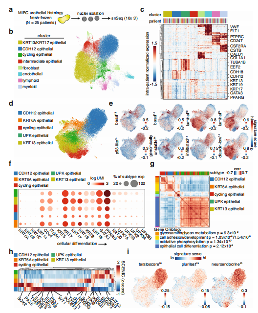 為了實(shí)現(xiàn)表征腫瘤內(nèi)異質(zhì)性的第一個(gè)目標(biāo),作者首先基于sn-RNAseq細(xì)胞類型比例研究了MIBC腫瘤的總體細(xì)胞組成(圖1a)。腫瘤由約90%的上皮細(xì)胞、5%的免疫細(xì)胞、3%的成纖維細(xì)胞和2%的內(nèi)皮細(xì)胞組成,這些細(xì)胞根據(jù)相應(yīng)的角蛋白、PTPRC、膠原蛋白、PECAM1、VWF等關(guān)鍵標(biāo)記基因(圖1b)。上皮間室無監(jiān)督聚類識(shí)別到了一個(gè)KRT13和KRT17差異表達(dá)的類群,KRT13、uroplakins(UPK)、KRT6A細(xì)胞周期相關(guān)基因類群,以及表達(dá)CDH12和其他上皮標(biāo)記物的細(xì)胞群(圖1d)。KRT13和UPK人群是僅有的兩個(gè)缺乏來自免疫浸潤MIBC的基因標(biāo)記的人群,這表明在這些人群中富集的腫瘤代表免疫“冷”腫瘤(圖1e)。進(jìn)一步交叉參照傳統(tǒng)的尿上皮分化相關(guān)標(biāo)記表明,KRT13和UPK群體代表一個(gè)更分化的表型,而CDH12、KRT6A和cycle群體代表一個(gè)未分化或去分化的表型(圖1f)。如預(yù)期一樣KRT13和UPK群體表達(dá)了一個(gè)上皮細(xì)胞分化網(wǎng)絡(luò)(圖1g)。基于單細(xì)胞調(diào)控網(wǎng)絡(luò)推斷和聚類分析,預(yù)測CDH12群體表現(xiàn)出多種發(fā)育相關(guān)轉(zhuǎn)錄因子的高活性,包括NANOG、EOMES、PAX1和HOXD9(圖1h)。CDH12和循環(huán)群體在干-樣和神經(jīng)內(nèi)分泌基因標(biāo)簽得分也高(圖1i)。