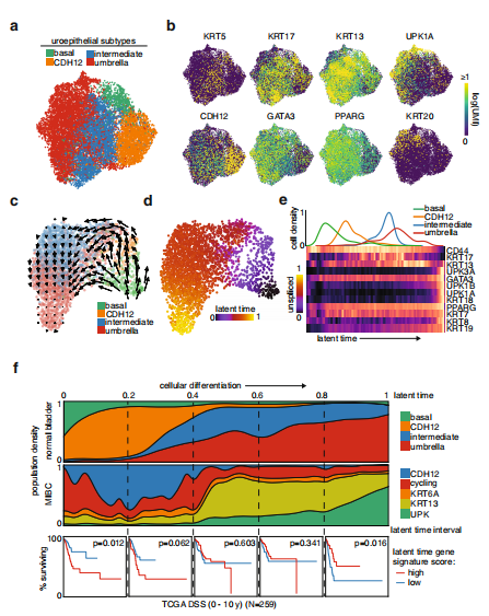 上皮細(xì)胞的無監(jiān)督聚類分為基礎(chǔ)、過渡和傘部類群(圖2a)。有趣的是CDH12群體與后一類典型群體明顯不同,而過渡群體的KRT13和KRT17表達(dá)水平最高(圖2b)。確定了一個(gè)始于基礎(chǔ)細(xì)胞的軌跡,隨后分化為兩種途徑:一種貫穿CDH12群體,一種跳過CDH12群體(圖2c和d)。關(guān)鍵的尿上皮分化標(biāo)記物沿著這條路徑跟蹤,在起始階段CD44高表達(dá),隨后中間是KRT13和KRT17,終點(diǎn)站為UPK1A、GATA3、PPARG(圖2e)。所有4個(gè)正常樣本的擬時(shí)序分析顯示出相似的路徑,CDH12群位于起始點(diǎn)附近(圖2f)。為了確定CDH12腫瘤細(xì)胞與正常腫瘤細(xì)胞之間的轉(zhuǎn)錄相似性,并推斷它們?cè)谡I掀ぜ?xì)胞分化軌跡上的位置,作者使用表達(dá)相似性,確定了每個(gè)MIBC上皮細(xì)胞中最接近的正常細(xì)胞,然后給腫瘤細(xì)胞分配相應(yīng)的正常潛伏期(圖2f)。值得注意的是,最未分化表型對(duì)應(yīng)的間隔得分預(yù)測了較差的疾病特異性生存(DSS),而最分化表型對(duì)應(yīng)的間隔得分預(yù)測了較好的DSS,中間的間隔得分顯示了相反結(jié)果之間的過渡(圖2f)。