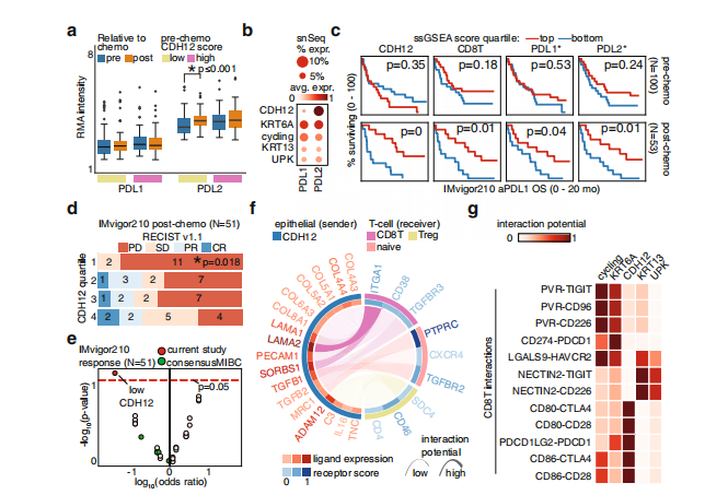 術(shù)前新輔助化療(NAC)和免疫檢查點(diǎn)治療(ICT)已經(jīng)徹底改變了膀胱癌的治療。然而,從這些模式中獲益最多的患者分層仍然是一個(gè)主要的臨床挑戰(zhàn)。作者將人類膀胱癌的單細(xì)胞核轉(zhuǎn)錄組、空間轉(zhuǎn)錄組和單細(xì)胞分辨率的空間蛋白組聯(lián)合分析,確定具有治療反應(yīng)預(yù)測能力的上皮細(xì)胞亞群。這些細(xì)胞表達(dá)Cadherin12(CDH12,N-Cadherin 2?)、catenins和其他上皮細(xì)胞的標(biāo)志物。CDH12富集的腫瘤可以定義患者是否接受NAC治療后預(yù)后效果差。富集CDH12的腫瘤對(duì)ICT表現(xiàn)出更好的效果。在所有情況下,通過對(duì)腫瘤CDH12富集進(jìn)行患者分層比目前膀胱癌亞型能更好的預(yù)后預(yù)測。CDH12群體類似于一種未分化的狀態(tài),具有固有的侵略性生態(tài)學(xué),包括化學(xué)耐藥性可能是通過祖細(xì)胞樣基因表達(dá)和成纖維細(xì)胞激活介導(dǎo)的。CDH12富集細(xì)胞表達(dá)PD-L1和PD-L2以及耗竭T細(xì)胞共定位,可能通過CD49a(ITGA1)介導(dǎo),為ICT在腫瘤中的功效提供一種解釋??傊?,本研究描述了一個(gè)對(duì)膀胱癌治療具有反向應(yīng)答的癌細(xì)胞群。重要的是還為臨床標(biāo)志物的篩選提供了一個(gè)令人信服的框架。