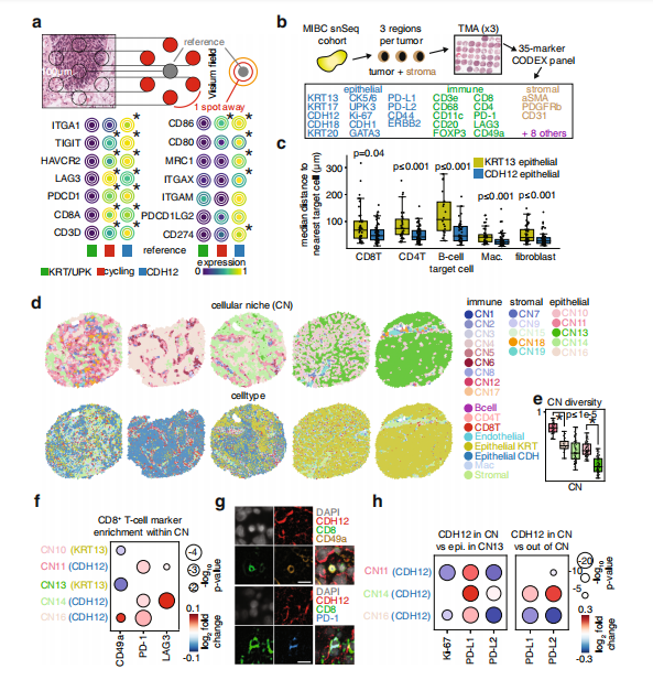 為了驗(yàn)證CDH12上皮細(xì)胞引起T細(xì)胞假說,作者使用Visium空間轉(zhuǎn)錄組和單細(xì)胞核轉(zhuǎn)錄組研究腫瘤中基因表達(dá)定位。CDH12富集的區(qū)域也富集了CD8T細(xì)胞marker和ITGA1(圖5a)。為了驗(yàn)證CDH12上皮細(xì)胞在單細(xì)胞水平上與T細(xì)胞共定位,作者設(shè)計(jì)并使用CODEX平臺(tái)對(duì)同一腫瘤隊(duì)列的腫瘤組織微陣列進(jìn)行了35位免疫組化檢測(圖5b)。