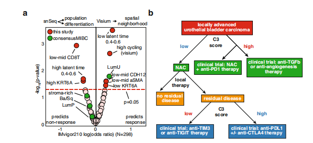 膀胱癌患者接受免疫治療后預(yù)后效果的好壞仍然是臨床上面臨的一個(gè)主要的挑戰(zhàn)。近期NC一篇文章通過單細(xì)轉(zhuǎn)錄組及空間轉(zhuǎn)錄組闡述了對(duì)膀胱癌治療具有反應(yīng)應(yīng)答的癌細(xì)胞群。獲得了在預(yù)測對(duì)免疫治療的反應(yīng)方面更優(yōu)的marker基因。有助于為患者的治療提供更理想更優(yōu)的治療方案。