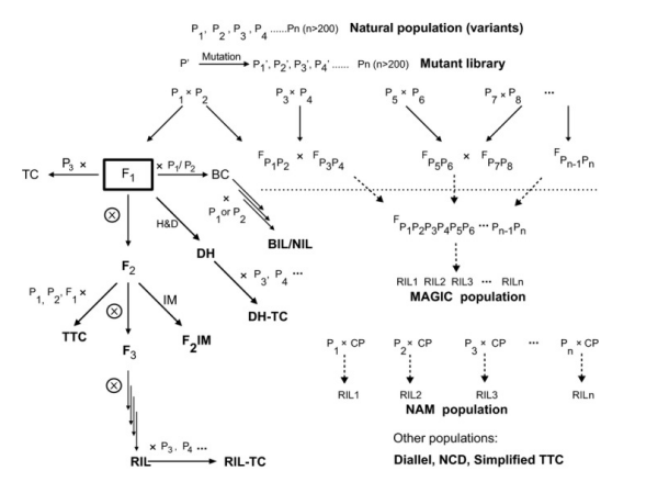 對于動植物群體,通常利用性狀具有顯著差異的兩個親本進行雜交,再通過自交、回交或者其他方式來構(gòu)建家系群體。家系群體按照遺傳穩(wěn)定性劃分可分為暫時性分離群體和永久性分離群體;如F1、F2、F3、BC等,這類群體中分離單位是個體,一經(jīng)自交或近交,其遺傳組成就會發(fā)生變化,無法永久使用,所以屬于暫時性分離群體;如RIL、DH等,這類群體中分離單位是株系(或者叫株行),不同株系間存在基因型的差異,而株系內(nèi)個體間的基因型是相同且純合的,自交不分離。這類群體通過自交或近交繁殖后,遺傳組成不會改變,可永久使用,所以屬于永久性分離群體。