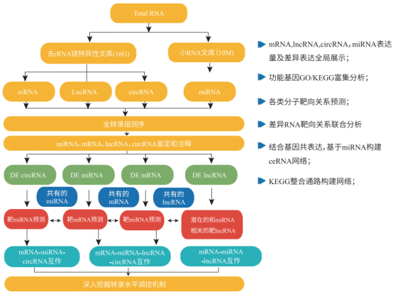 百邁客全轉(zhuǎn)錄組測序服務是一次檢測,獲得四種分子(mRNA、lncRNA、circRNA、miRNA)信息,針對不同類型的RNA進行表達分析,結(jié)構研究以及全新轉(zhuǎn)錄本的發(fā)現(xiàn),并結(jié)合競爭性內(nèi)源RNA(ceRNA)機制,進行聯(lián)合分析,深入挖掘轉(zhuǎn)錄水平調(diào)控網(wǎng)絡,深度探究各類RNA分子的調(diào)控機制。分析內(nèi)容如下:
