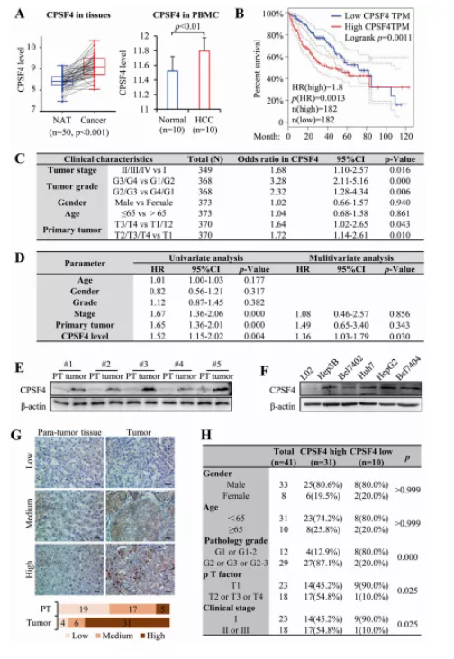 由于CPSF4表達在HCC中顯著增加,并且其高水平表達對應于HCC中OS的最高風險,因此本研究將重點放在CPSF4上。通過比較50對配對的序列數(shù)據(jù),發(fā)現(xiàn)HCC腫瘤組織中CPSF4表達水平顯著高于正常鄰近組織。來自GSE49515的微陣列數(shù)據(jù)還表明,10名HCC患者的外周血單核細胞(PBMC)樣本中的CPSF4水平顯著高于10名健康對照,這表明CPSF4可以作為HCC診斷的生物標志物(圖 1A)。Kaplan-Meier對364例患者的生存分析顯示,5 年生存率從 CPSF4低表達患者的57%±5%下降到CPSF4高表達患者的42%±5%(p < 0.01,圖 1B)。進一步的相關分析表明,CPSF4與臨床TNM分期、病理分級和臨床分期顯著相關(圖 1C)。單變量分析表明HCC患者的OS率與高CPSF4表達之間存在關聯(lián)(p < 0.01)。多變量Cox回歸分析顯示CPSF4水平(p = 0.03)是OS的獨立預后因素(圖 1D)。