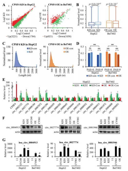 為了驗證,本研究首先從GEO數(shù)據(jù)庫中選擇了HCC組織中807個下調(diào)的circRNA(FC>2,p<0.05);然后從RNA-seq數(shù)據(jù)中篩選了1447個在CPSF4-OE細胞中下調(diào)或在CPSF4-KD細胞中上調(diào)的circRNA。這兩組數(shù)據(jù)取交集,共得到24個circRNA作為驗證的候選circRNA;結(jié)構分析表明其中16個含有PAS序列。實時PCR結(jié)果顯示,這16個circRNA中有13個在CPSF4-OE細胞中被抑制,但在CPSF4-KD細胞中被激活(圖 2E)。選擇2個帶有PAS元件的circRNA,hsa_circ_0027774 和 hsa_circ_0004913 作為CPSF4靶向的circRNA;同時,另一個廣泛研究的不含PAS元件的circRNA hsa_circ_0001946作為CPSF4非靶向circRNA。Northern blot結(jié)果表明hsa_circ_0027774和hsa_circ_0004913與CPSF4呈負相關,但hsa_circ_0001946在所有細胞系中保持相同水平(圖 2F)。同時構建了這三種circRNA的OE質(zhì)粒并與CPSF4 OE或KD質(zhì)粒共轉(zhuǎn)染,real-time PCR結(jié)果顯示帶有PAS的circRNA(hsa_circ_0027774和hsa_circ_0004913)與CPSF4水平呈負相關,而不含PAS的circRNA(hsa_circ_0027774和hsa_circ_0004913)不受CPSF4的影響(圖 2G),這說明CPSF4在轉(zhuǎn)錄后抑制了circRNA??傊珻PSF4直接調(diào)節(jié)HCC細胞中帶有PAS元件的circRNA的表達。