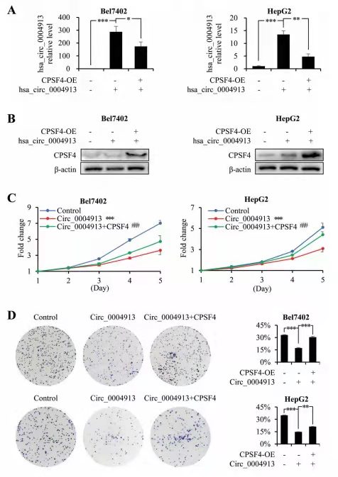 在Bel7402和HepG2細胞中生成hsa_circ_0004913-OE細胞,然后用CPSF4質(zhì)粒轉(zhuǎn)染。分別通過蛋白質(zhì)印跡和實時PCR檢測每個細胞系中的CPSF4蛋白和hsa_circ_0004913表達水平(圖 4A,B)。與對照細胞相比,hsa_circ_0004913-OE細胞顯示出較慢的增殖和較低的克隆形成。然而,CPSF4的OE可以消除hsa_circ_0004913的腫瘤抑制作用,因為CPSF4轉(zhuǎn)染后生長速度和克隆形成能力恢復(圖 4C,D)。這些結(jié)果表明circRNA在CPSF4介導的HCC細胞腫瘤發(fā)生中的重要作用。