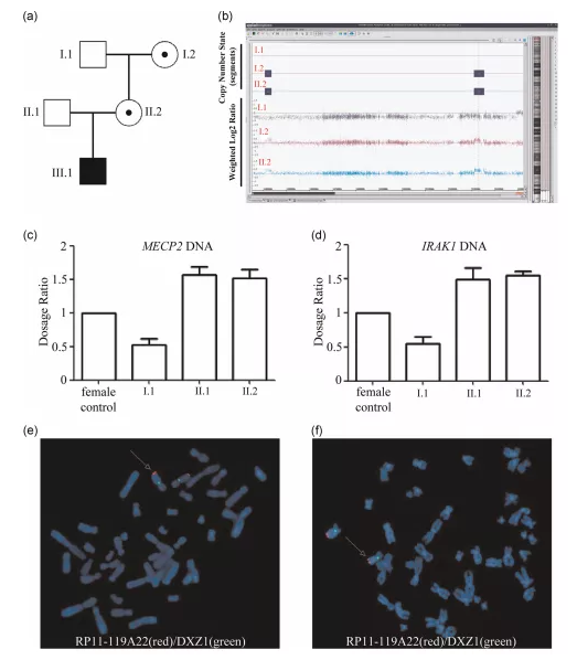使用SNP微陣列檢測I.1、I.2和II.2的變化。在II.2和I.2(圖1b)中,在Xq28區(qū)域和Xq27.3區(qū)域分別顯示了437KB的重復(fù)和284KB的重復(fù),這表明Xq28和Xq27.3重復(fù)是母系遺傳的。Xq28區(qū)域包含13個(gè)在線孟德爾人遺傳(OMIM)基因(包括MECP2、IRAK1、L1CAM、NAA10和HCFC1)。通過qRT-PCR以驗(yàn)證結(jié)果,在男性I.1中檢測到MECP2和IRAK1一個(gè)基因劑量的拷貝,而在正常對(duì)照女性中檢測到兩個(gè)拷貝,在I.2和II.2中檢測到三個(gè)拷貝(圖1c,d)。對(duì)女性I.2和II.2的中期染色體進(jìn)行FISH分析,發(fā)現(xiàn)含有MECP2的探針RP11-119A22僅在Xq28處有信號(hào),這表明Xq28重復(fù)是串聯(lián)的,沒有整合到基因組的其他地方(圖1e,f)。