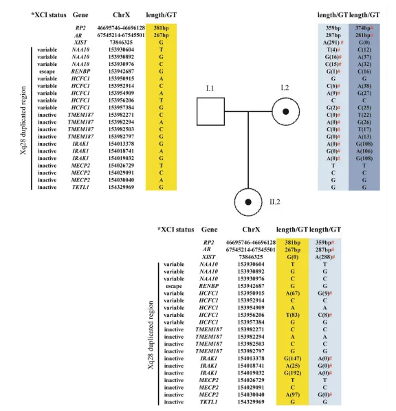 作者進(jìn)行了基于PCR的AR和RP2分析,以評(píng)估外周血中的XCI模式。使用甲基化敏感的限制性內(nèi)切酶HpaII,使PCR只擴(kuò)增非活性X染色體上的等位基因。通過分離分析確定了失活X染色體的起源。