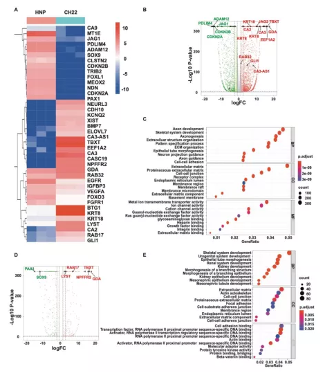 與HNP相比,在CH22中確定了313個增加的DAR 和 1,749 個減少的DAR。DAR的motif分析顯示CTCF、Nkx2-2、Tcfe2a_2、MED-1 和 E2A motif在CH22中高度富集。還確定了DAR中的DEG,如GDA、TBXT和PAX1(圖 1D)。GO分析顯示DAR中的基因與骨骼系統(tǒng)發(fā)育有關(guān)(圖 1E);KEGG富集分析顯示這些基因富集在PI3K-AKT信號通路上。
