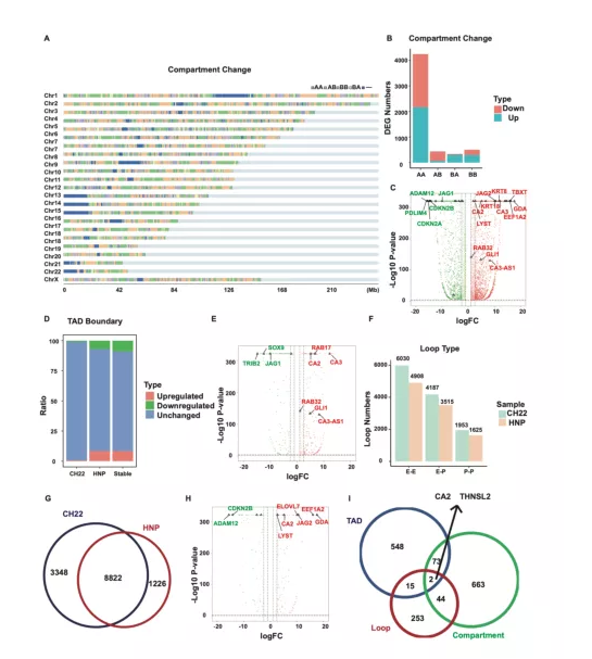 在基因調(diào)控中,增強(qiáng)子通過染色質(zhì)Loop激活啟動子。本研究在HNP和CH22中分別檢測到10,048和12,170個Loop,中位數(shù)長度為100,000 bp。通常認(rèn)為,與增強(qiáng)子相關(guān)的Loop可以增加基因表達(dá)。本研究在HNP和CH22中分別鑒定了3,515和4,187個啟動子-增強(qiáng)子loop(圖3F)。其中,ATAC-seq峰分別支持2,495 和1,732個。此外,在CH22中發(fā)現(xiàn)了比HNP更多的啟動子loop和增強(qiáng)子loop。