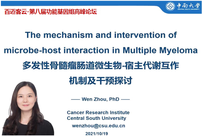 中南大學(xué)腫瘤研究所周文研究員的報(bào)告題目是“多發(fā)性骨髓瘤腸道微生物-宿主代謝互作機(jī)制及干預(yù)”,周老師首先介紹了多發(fā)性骨髓瘤(Multiple Myeloma, MM)的特點(diǎn),隨后介紹了課題組利用宏基因組測(cè)序技術(shù)得到的發(fā)現(xiàn),MM患者腸道微生物生態(tài)紊亂,并出現(xiàn)氮源微生物的優(yōu)勢(shì)生長,腸道微生物-宿主代謝兩者互作從而加速宿主MM的腫瘤進(jìn)程。通過干預(yù)MM患者腸道菌群和氮源攝入可作為MM治療的新靶標(biāo)。
