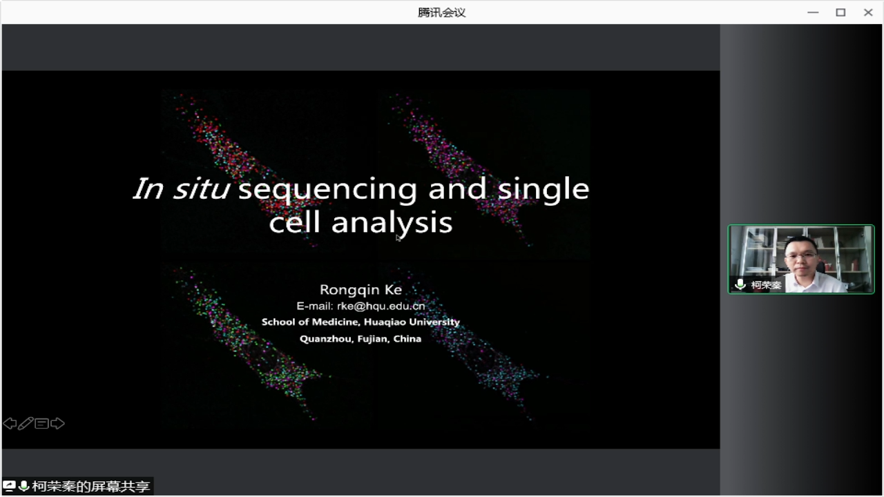 午后休息結(jié)束,華僑大學(xué)醫(yī)學(xué)院柯榮秦教授帶來(lái)的報(bào)告是:原位測(cè)序技術(shù)與單細(xì)胞分析?;趩渭?xì)胞測(cè)序的基因表達(dá)分析需要將單個(gè)細(xì)胞從組織中分離出來(lái),這個(gè)過(guò)程使所分析的單細(xì)胞丟失了空間位置信息??吕蠋焾F(tuán)隊(duì)開發(fā)了原位測(cè)序(in situ sequencing, ISS),是一種基于成像的空間轉(zhuǎn)錄組學(xué)技術(shù)。該技術(shù)可以在細(xì)胞甚至亞細(xì)胞分辨率下提供低通量到高通量的空間基因表達(dá)信息,將ISS技術(shù)應(yīng)用于癌癥組織中基因表達(dá)異質(zhì)性的可視化分析,并將之應(yīng)用于人腦組織單細(xì)胞測(cè)序所獲得的感興趣的基因的定位以補(bǔ)充其失去的空間位置信息。此外,還開發(fā)了一系列新型的具有更高的檢測(cè)靈敏度和更好的分辨率的單分子RNA原位雜交方法,可以在細(xì)胞和組織中對(duì)感興趣的RNA轉(zhuǎn)錄本進(jìn)行原位成像分析。我們相信我們所開發(fā)的原位RNA表達(dá)分析技術(shù)具有廣泛地用于生物和醫(yī)學(xué)的研究的潛力。