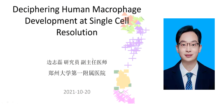 前面兩場(chǎng)報(bào)告湯老師和曹老師都是開發(fā)了單細(xì)胞空間新技術(shù),這些技術(shù)如何實(shí)現(xiàn)在臨床醫(yī)學(xué),特別是在腫瘤中精準(zhǔn)輔助治療應(yīng)用呢?鄭州大學(xué)第一附屬醫(yī)院血液科副主任醫(yī)師邊志磊研究員報(bào)告題目是:Deciphering human macrophage development at single-cell resolution,以超高單細(xì)胞分辨率深度解析了巨噬細(xì)胞發(fā)育。邊老師團(tuán)隊(duì)繪制了巨噬細(xì)胞在多個(gè)解剖部位的異質(zhì)性,并確定了不同的亞群,包括各種類型的胚胎組織駐留巨噬細(xì)胞(TRMs)(在頭部、肝臟、肺和皮膚)。追蹤了胚胎卵黃囊來(lái)源的原始巨噬細(xì)胞或卵黃囊衍生的偏髓性祖細(xì)胞(YSMPs)來(lái)源的胚胎肝單核細(xì)胞中TRM的發(fā)育軌跡,評(píng)估了胚胎期TRM和成年期TRM之間的分子相似性。全面描述了人類胚胎發(fā)生過(guò)程中早期巨噬細(xì)胞發(fā)育的時(shí)空動(dòng)態(tài)特征,為進(jìn)一步研究人類TRM的發(fā)育和功能提供了參考。