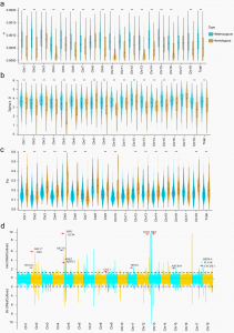 通過(guò)同源染色體比對(duì),鑒定到3,107,171 個(gè)SNPs、 500,018 個(gè)indels、57,643 個(gè)PAVs以及632 個(gè)倒位。高雜合度區(qū)域的進(jìn)化速度比其他區(qū)域更快。