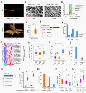 馴化使木薯塊根的產(chǎn)量和淀粉含量顯著增加。栽培品種的塊根重和淀粉含量分別比野生后代高約60倍和3倍(圖4a,b)。選擇性清除分析結(jié)合轉(zhuǎn)錄組分析發(fā)現(xiàn)2號(hào)染色體MeT