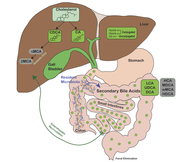 初級(jí)膽汁酸進(jìn)入腸粘膜后,會(huì)產(chǎn)生50多種不同的次級(jí)膽汁酸。膽汁酸的化學(xué)多樣化是宿主(產(chǎn)生初級(jí)膽汁酸)和腸道微生物群(產(chǎn)生次級(jí)膽汁酸)共同努力的結(jié)果。最近,人們對(duì)腸道微生物-膽汁酸-宿主軸的研究正在擴(kuò)展到包括胃腸學(xué)、內(nèi)分泌學(xué)、腫瘤學(xué)和傳染病在內(nèi)的多個(gè)領(lǐng)域。[1]