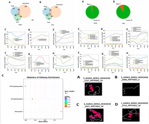 在本研究中,作者生成了斑馬魚幼魚的時間表達(dá)轉(zhuǎn)錄本圖譜,揭示了調(diào)控斑馬魚幼魚lncRNAs表達(dá)譜的晝夜動態(tài)。本研究發(fā)現(xiàn)了3220個lncRNAs在DD和LL條件下的表達(dá)譜,鑒定了578個周期表達(dá)的lncRNAs,并使用GO、COG和KEGG途徑富集分析對其進行注釋,結(jié)果表明,大多數(shù)這些節(jié)律表達(dá)的幼魚lncRNAs可能參與了關(guān)鍵的生物學(xué)過程。通過比較來自松果體和精巢的lncRNAs,發(fā)現(xiàn)9個(DD)和12個(LL)幼魚lncRNAs分別在斑馬魚松果體和精巢中共同表達(dá),在這些共表達(dá)的lncRNAs編碼的多肽中,發(fā)現(xiàn)3個多肽(DD)和1個多肽(LL)具有蛋白質(zhì)數(shù)據(jù)庫中已知的結(jié)構(gòu)域。作者研究了這些共表達(dá)的lncRNAs編碼的多肽,以預(yù)測它們的3D模型和功能。此外,對人類、小鼠和果蠅的幼魚lncRNAs進行了保守分析,發(fā)現(xiàn)斑馬魚幼魚在DD和LL條件下分別與人類共享35和42個lncRNAs,與小鼠共享1個和4個lncRNAs。作者選擇了這三個物種共享的5種節(jié)律表達(dá)的lncRNAs進行編碼性研究,發(fā)現(xiàn)了這5種lncRNAs編碼的數(shù)百種多肽,對這些保守肽研究了它們的三維模型和相應(yīng)的已知結(jié)構(gòu)域,發(fā)現(xiàn)在α-螺旋、β-鏈和隨機卷曲方面具有相似性。這些結(jié)果將幫助晝夜節(jié)律生物學(xué)家選擇晝夜表達(dá)的lncRNA,以進行進一步的功能研究。