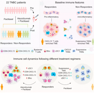 2021年10月14日,中國(guó)醫(yī)學(xué)科學(xué)院腫瘤醫(yī)院聯(lián)合北京大學(xué)生物醫(yī)學(xué)前沿創(chuàng)新中心在國(guó)際期刊Cancer Cell上在線發(fā)表了題為“Single-cell analyses reveal key immune cell subsets associated with response to PD-L1 blockade in triple negative breast cancer”的研究論文,該團(tuán)隊(duì)結(jié)合單細(xì)胞RNA- seq、TCR-seq和ATAC-seq等技術(shù),研究紫杉醇(paclitaxel,化療)聯(lián)合anti-PD-L1抗體阿替利珠單抗(atezolizumab 免疫治療)治療TNBC(三陰性乳腺癌)患者腫瘤微環(huán)境和外周血中的免疫細(xì)胞動(dòng)力學(xué),揭示應(yīng)答者和無(wú)應(yīng)答者的免疫特征,紫杉醇化療聯(lián)合阿替利珠單抗免疫治療在TNBC治療中的機(jī)制和相互作用。