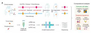 在該課題的研究人員收集了來(lái)自22例TNBC患者(11例接受阿替利珠單抗聯(lián)合紫杉醇化療,11例接受紫杉醇單藥化療)治療前和治療后的78例配對(duì)樣本,通過(guò)整合單細(xì)胞轉(zhuǎn)錄組測(cè)序、T細(xì)胞受體序列測(cè)序和染色質(zhì)可及性測(cè)序,構(gòu)建了TNBC患者腫瘤微環(huán)境和外周血來(lái)源免疫細(xì)胞的高分辨率轉(zhuǎn)錄組和表觀組動(dòng)態(tài)圖譜。該研究在單細(xì)胞水平上對(duì)來(lái)自接受兩種治療方案的TNBC病人的腫瘤組織和外周血的免疫細(xì)胞動(dòng)態(tài)分析,系統(tǒng)比較了應(yīng)答患者和非應(yīng)答患者的腫瘤微環(huán)境及外周血免疫特征,闡明了免疫細(xì)胞在不同治療方案下的動(dòng)態(tài)變化,揭示了anti-PD-L1免疫治療聯(lián)合紫杉醇化療在TNBC中的作用機(jī)制。