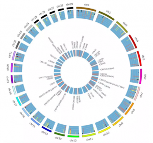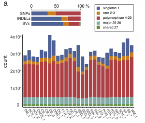 圖2 27個狗中SNPs、indels和SVs的分布