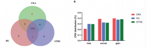 (1)例如,在416個奶山羊中鑒定得到了7,208個CNVs,GWAS分析發(fā)現(xiàn)31個CNVs所在區(qū)域與產(chǎn)奶量等性狀顯著相關(guān),并且發(fā)現(xiàn)在顯著相關(guān)的CNVs中,注釋的基因大多數(shù)在產(chǎn)奶相關(guān)的生物過程和健康相關(guān)性狀中發(fā)揮著重要作用。在另一個研究中,利用新開發(fā)的GWAScore方法整合已發(fā)表的GWAS數(shù)據(jù)來鑒定潛在的候選位點,并對3個不同品種(CKA,n=10、HU,n=10、STHS,n=9)山羊進(jìn)行全基因組CNVs檢測(圖3),通過將CNVs與GWAScore和QTL位點相整合,發(fā)現(xiàn)197個候選基因與CNVs存在重疊,進(jìn)一步鑒定得到28個與生長性狀相關(guān)的CNVs。