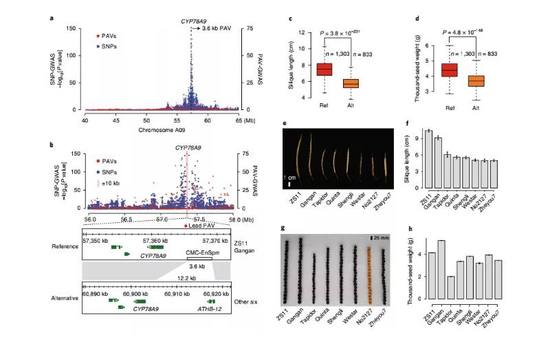 (2)在除水稻以外的作物中也有使用SVs進(jìn)行GWAS的報道。例如,在玉米中,521個自交系玉米基因組序列中的SVs被用于繪制玉米SV圖譜;在小麥中發(fā)現(xiàn)了影響染色體3B上基因和轉(zhuǎn)座元件的SV;在最近的一項木瓜研究中(使用栽培木瓜和野生木瓜),共鑒定出8083個SVs,其中包括5260個缺失,552個串聯(lián)重復(fù)和2271個插入,在該研究中,還發(fā)現(xiàn)CNVs與生長和對環(huán)境壓力的反應(yīng)有關(guān);在油菜中,基于鑒定得到的數(shù)百萬SVs和PAVs用于PAV-GWAS,直接鑒定到了莢果長度、種子重量和開花時間相關(guān)的結(jié)構(gòu)變異,這些是之前基于單核苷酸變異SNP進(jìn)行的GWAS所沒能鑒定出來的,充分說明了PAV-GWAS可以互補于SNP-GWAS用來鑒定特定性狀相關(guān)的位點(圖7);另外,其他植物SVs鑒定例子包括:溝酸漿屬的耐鹽性、葡萄的漿果顏色和番茄的馴化性狀等研究。