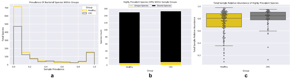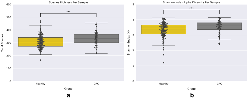 使用基于em的方法計(jì)算每個(gè)樣本內(nèi)物種的相對豐度,以構(gòu)建一個(gè)樣本分類單元矩陣,通過測量每個(gè)樣本的細(xì)菌豐富度和Shannon指數(shù),利用該矩陣探究兩個(gè)樣本組(健康和晚期CRC)的微生物多樣性。CRC組的樣本顯示出更大的多樣性,包括豐富度和Shannon指數(shù)(Mann-Whitney U檢驗(yàn):MWU);豐富度:MWU pvalue = 0.0005, Shannon指數(shù):MWU pvalue = 0.0009)(圖一a,b)。由于物種多樣性的量度對物種均勻度和豐富度的敏感性不同,還應(yīng)用了辛普森指數(shù)來計(jì)算樣本組內(nèi)的物種多樣性,這些結(jié)果與之前的分析一致,CRC樣本中的物種多樣性與健康樣本中的物種多樣性有顯著性差異(MWU值= 0.0238).