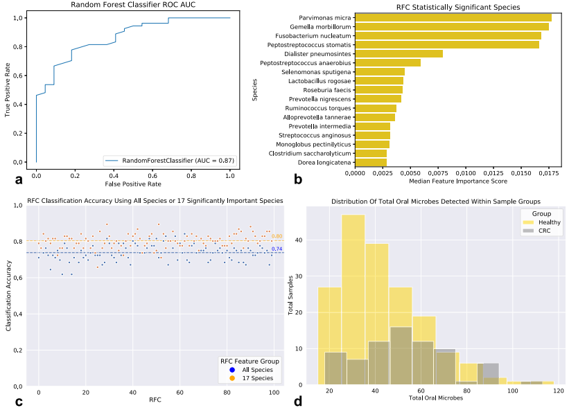 有趣的是,許多在CRC中被認(rèn)為非?!爸匾鼻蚁鄬ωS度較高的物種也存在于口腔微生物組中,也與部分口腔疾病(牙周炎、根尖周病變、根管感染、口腔癌等)、CRC風(fēng)險(xiǎn)的增加有關(guān)。隨后,我們通過人類口腔微生物數(shù)據(jù)庫(eHOMD)對我們樣本中的所有口腔物種進(jìn)行分類,發(fā)現(xiàn)與健康組相比,CRC相關(guān)腸道微生物組內(nèi)存在的總口腔微生物種群豐富度顯著增加(MWU: pvalue = 6.51e-05)(圖2 d)。