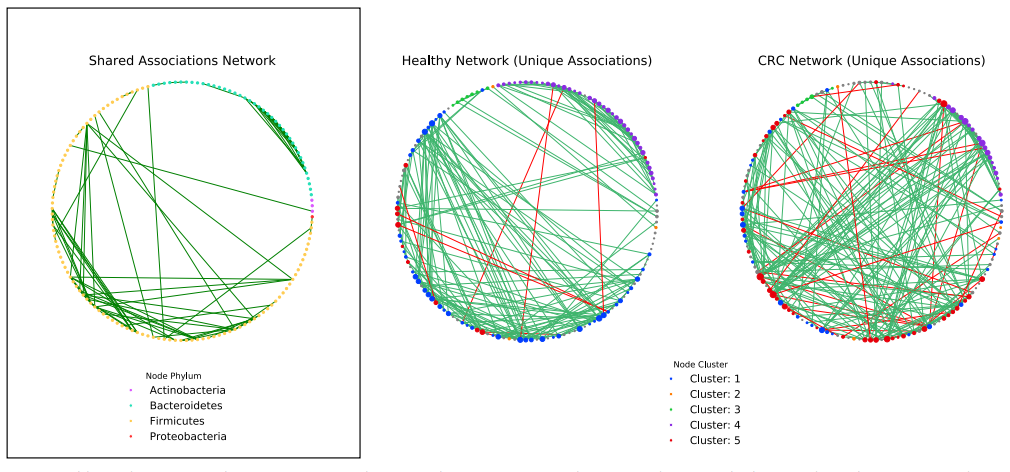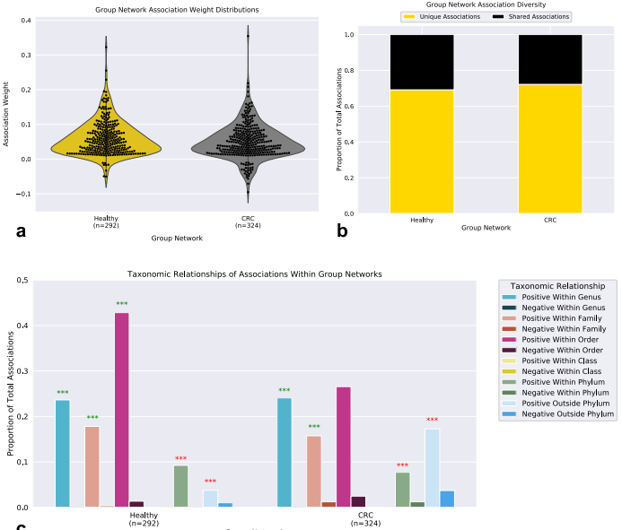 群體網(wǎng)絡(luò)包含相似的關(guān)聯(lián)權(quán)重分布,正相關(guān)比負(fù)相關(guān)更多(圖4a)。值得注意的是,與健康網(wǎng)絡(luò)相比,CRC包含更多的負(fù)相關(guān)。29%的負(fù)相關(guān)涉及一種被認(rèn)為是口腔微生物的物種,而在健康網(wǎng)絡(luò)中,沒有發(fā)現(xiàn)涉及口腔菌群。在網(wǎng)絡(luò)中發(fā)現(xiàn)的大多數(shù)關(guān)聯(lián)是該網(wǎng)絡(luò)獨(dú)有的(健康:69%,CRC:72%)(圖4b)。我們假設(shè)群落結(jié)構(gòu)的這種巨大差異可以反映生態(tài)系統(tǒng)的變化,并進(jìn)而分析了網(wǎng)絡(luò)中物種之間的分類關(guān)系(圖4c)。兩個(gè)網(wǎng)絡(luò)在同一屬內(nèi)的物種(健康:MCS pvalue= 0.00099,CRC:MCS pvalue= 0.00099)和家族(健康:MCS值= 0.00099,CRC:MCS= 0.00099 )。然而,只有在健康組的網(wǎng)絡(luò)中,物種與來自同一順序的其他物種的積極相關(guān)仍然明顯多于隨機(jī)相關(guān)(健康:MCS pvalue= 0.00099,CRC: MCS pvalue = 0.44)。與健康網(wǎng)絡(luò)(健康:4%,CRC:17%)相比,CRC的網(wǎng)絡(luò)在分類上的遠(yuǎn)緣關(guān)系中顯示出更大的豐度,在健康網(wǎng)絡(luò)中分類上的遠(yuǎn)緣微生物之間的正關(guān)聯(lián)仍然顯著較少(門內(nèi):MCS值= 0.00099,門外:MCSp值= 0.00099)和CRC(門內(nèi):MCS pvalue= 0.00099,門外:MCS pvalue= 0.00099)而不是隨機(jī)網(wǎng)絡(luò)。