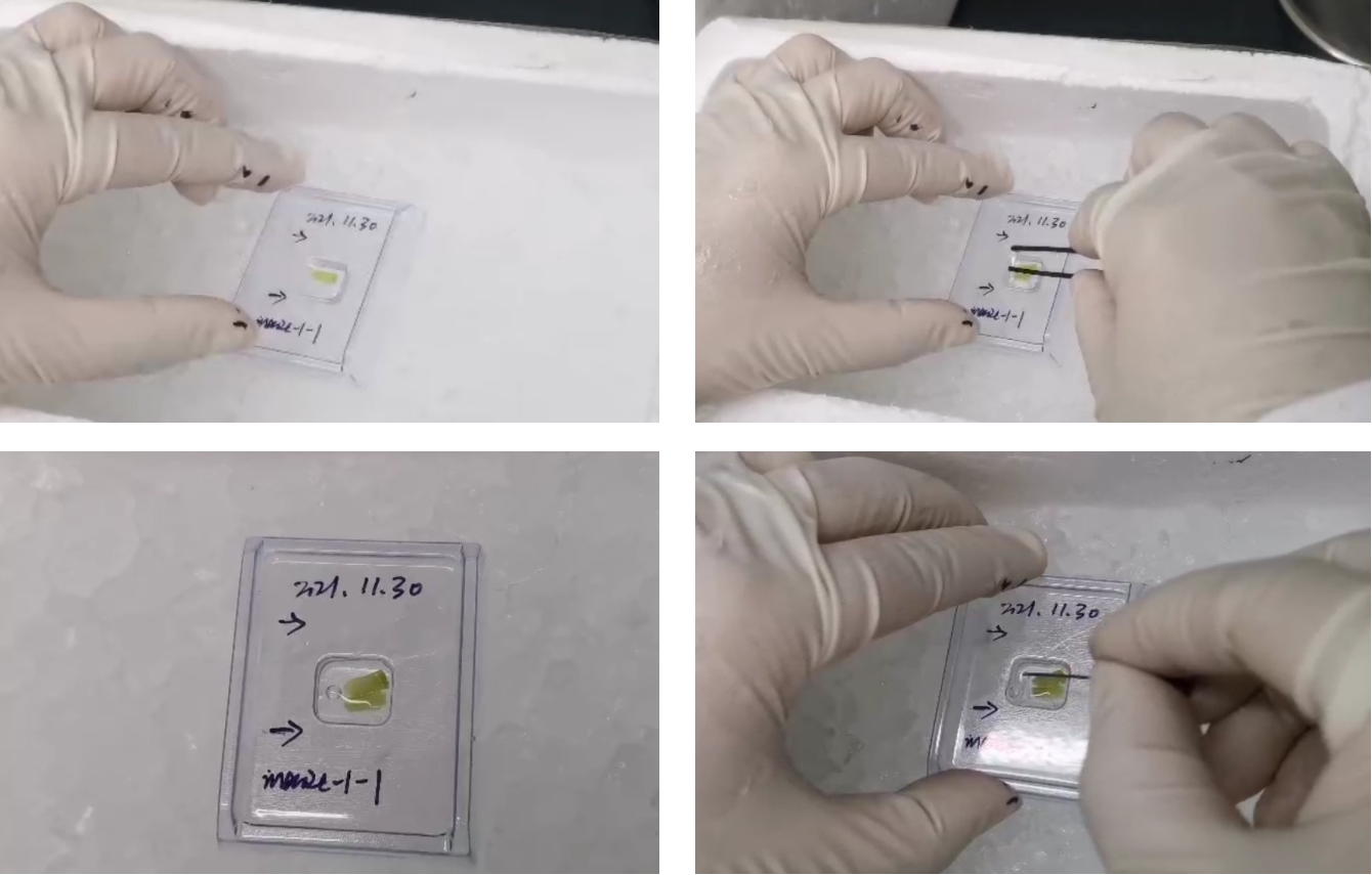 在冰上操作,用鑷子輕輕夾住組織,緩慢加入預(yù)冷的OCT包埋劑,直至OCT完全包裹組織,并調(diào)整組織在OCT中的位置,保證目標(biāo)平面與切面水平一致,尤其是多個(gè)組織包埋一定要排列整齊,避免重疊在一起,此過程中避免產(chǎn)生氣泡,如有氣泡產(chǎn)生用用針尖輕緩挑出氣泡。