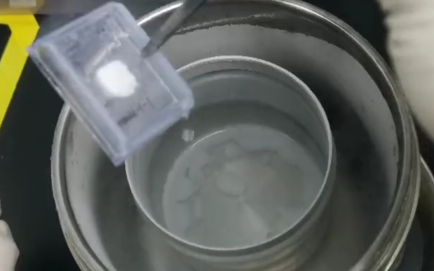 在無菌超凈臺(tái)中,用異戊烷(足以完全浸沒組織包埋盒)填充三分之二的金屬燒杯,然后放入液氮杜瓦瓶中(液氮與異戊烷保持相同的水平面)以充分接觸,孵育 5-10 分鐘,時(shí)間不宜太久,防止異戊烷凝結(jié)。