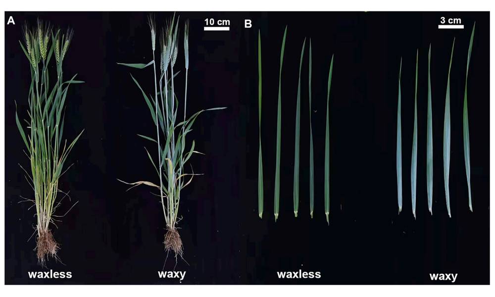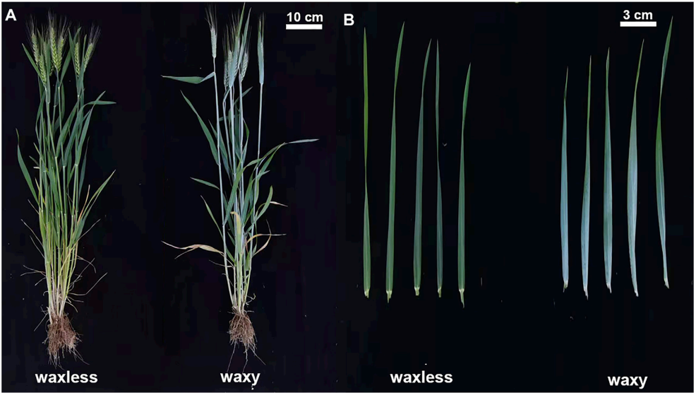 材料:EMS誘變22號(hào)高產(chǎn)品種冀麥,分離出蠟質(zhì)(waxy)和無(wú)蠟質(zhì)突變體(waxyless),種植至抽穗期取葉片組織。