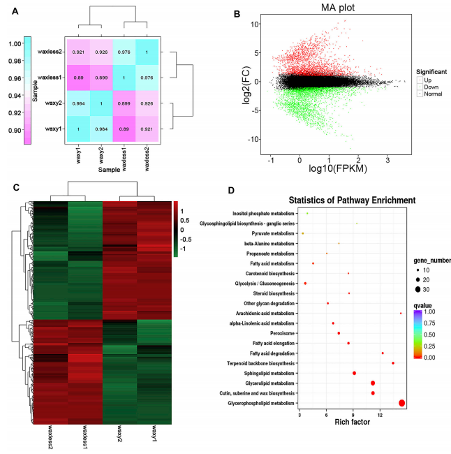 此外,我們注釋了3659個(gè)DGE的脂質(zhì)功能,篩選了343個(gè)DGE,并使用KEGG富集分析對(duì)其進(jìn)行富集(圖2C,D)。研究發(fā)現(xiàn),這些基因主要集中在甘油磷脂代謝、角質(zhì)層、亞油酸和蠟的生物合成、甘油脂代謝、鞘脂代謝、萜類(lèi)主干生物合成、脂肪酸降解和脂肪酸伸長(zhǎng)途徑中,這與該研究中控制小麥葉片光澤表型的主要脂質(zhì)組分一致。