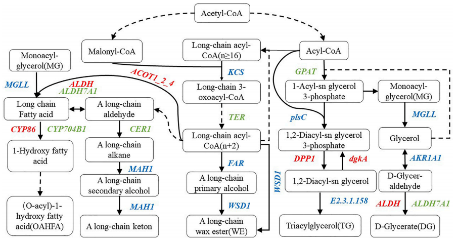 在OAHFA合成過(guò)程中,?;o酶A硫代酯酶1/2/4基因(ACOT1_2_4)的上調(diào)表達(dá)促進(jìn)長(zhǎng)鏈脂肪酸的合成,而?;视椭久富颍∕GLL)的表達(dá)水平在單酰基甘油轉(zhuǎn)化為長(zhǎng)鏈脂肪酸的過(guò)程中上調(diào)和下調(diào)。醛脫氫酶家族7個(gè)成員A1基因(ALDH7A1)表達(dá)下調(diào)抑制了A長(zhǎng)鏈醛與長(zhǎng)鏈脂肪酸之間的過(guò)渡,醛脫氫酶基因(ALDH)則上調(diào)了A長(zhǎng)鏈醛與長(zhǎng)鏈脂肪酸之間的過(guò)渡。在長(zhǎng)鏈脂肪酸轉(zhuǎn)化為ω-羥基脂肪酸的過(guò)程中,長(zhǎng)鏈脂肪酸ω-單加氧酶基因(CYP704B1)的表達(dá)下調(diào),而突變無(wú)蠟脂肪酸ω-羥化酶基因(CYP86)的表達(dá)上調(diào)。甘油-3磷酸?;D(zhuǎn)移酶基因(GPAT)和ALDH7A1在DG、MG和TG的甘油酯代謝過(guò)程中下調(diào)。在無(wú)蠟情況下,葡萄糖的表達(dá)下調(diào)抑制了1-?;?sn甘油3-磷酸的合成,從而減少了鎂的合成。ALDH7A1在低蠟突變體中的下調(diào)表達(dá)降低了DG的合成。上調(diào)基因?yàn)锳LDH、二酰甘油二磷酸磷酸酶基因(DPP1)和二酰甘油激酶基因(dgkA),而1-?;?SN-甘油-3-磷酸?;D(zhuǎn)移酶基因(plsC)的表達(dá)為磷脂:酰甘油?;D(zhuǎn)移酶基因(E2.3.1.158)、MGLL和酒精脫氫酶基因(AKR1AI)均上調(diào)和下調(diào)。這些基因共同作用降低低蠟突變無(wú)蠟細(xì)胞中TG的含量。