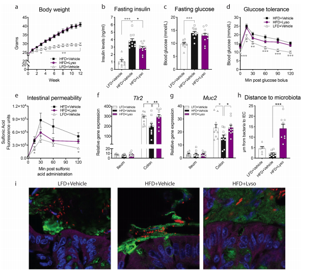 該文章首先研究了溶菌酶對(duì)飲食誘導(dǎo)型肥胖小鼠的潛在影響。研究結(jié)果發(fā)現(xiàn),與喂食LFD的小鼠相比,喂食HFD的小鼠體重增加了更多,每天補(bǔ)充溶菌酶對(duì)身體成分或能量攝入沒有產(chǎn)生可測(cè)量的影響(圖1a),然而,接受溶菌酶治療的小鼠確實(shí)表現(xiàn)出了更低的空腹胰島素水平(圖1b)。與Vehicle+HFD組相比,溶菌酶更傾向于降低餐后血糖而不是空腹血糖。葡萄糖刺激的胰島素濃度不受溶菌酶補(bǔ)充的影響。與已知可以調(diào)節(jié)腸道滲漏的空腹胰島素減少類似,本文研究者們?cè)谌芫腹辔傅膭?dòng)物中觀察到HFD誘導(dǎo)的腸道通透性出現(xiàn)數(shù)值保護(hù)(圖1e)。這些體內(nèi)跡象表明HFD喂養(yǎng)的小鼠腸道通透性增加,且循環(huán)LPS、腸炎癥以及與結(jié)腸和回腸緊密連接基因的表達(dá)在組間保持相似。盡管如此,溶菌酶還是使HFD誘導(dǎo)的結(jié)腸中Tlr2表達(dá)的減少維持在正常范圍內(nèi)(圖1f)。根據(jù)已有研究顯示,TLR2的激活與結(jié)腸杯狀細(xì)胞的黏液調(diào)節(jié)有關(guān),因此本文研究者們調(diào)查了黏液的產(chǎn)生,發(fā)現(xiàn)補(bǔ)充溶菌酶可防止HFD誘導(dǎo)的結(jié)腸Muc2下調(diào)(圖1g)。進(jìn)一步的,發(fā)現(xiàn)這種溶菌酶介導(dǎo)的黏液完整性保存,可能是由于腸上皮細(xì)胞到最近細(xì)菌的平均距離增加6倍以上導(dǎo)致,從而說明補(bǔ)充溶菌酶足以防止HFD引起的微生物區(qū)系侵蝕(圖1h-i)。
