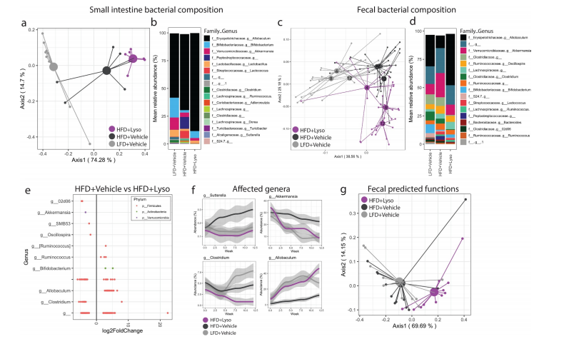 由于微生物區(qū)系侵蝕的減少也可能由于溶菌酶具有潛在的殺菌活性,因此本文研究者接下來評(píng)估了實(shí)驗(yàn)小鼠糞便微生物群的縱向變化。在研究開始時(shí),所有的小鼠都低脂喂養(yǎng),且微生物組成分析顯示這些小鼠的微生物組成具有相似性。HFD喂養(yǎng)導(dǎo)致了小腸和糞便樣本中的微生物群組成產(chǎn)生了巨大差異(圖2a-d)??v向抽樣顯示,飲食干預(yù)導(dǎo)致糞便微生物群發(fā)生即時(shí)變化,而溶菌酶給藥的影響逐漸顯現(xiàn)。與其他組相比,每天接受口服溶菌酶的小鼠,其微生物群落在結(jié)構(gòu)上表現(xiàn)出獨(dú)特和漸進(jìn)的軌跡(圖2c)。但盡管如此,除在小腸中,一些HFD誘導(dǎo)的糞便微生物變化可以通過補(bǔ)充溶菌酶來抵抗(圖2a-f)。微生物群的alpha多樣性不受溶菌酶給藥的影響,說明該溶菌酶沒有相應(yīng)明顯的抗菌作用。與vehicle組小鼠相比,接受溶菌酶的小鼠糞便中大量細(xì)菌ASVs的相對(duì)豐度被修飾了,且受調(diào)控的ASVs大多屬于厚壁菌門,其中Akkermansia muciniphila和Oscillospira(顫螺菌屬)減少,胃瘤胃球菌屬的一種未分類的胃瘤胃球菌、假長(zhǎng)雙歧桿菌和異歧桿菌的相對(duì)豐度則增加(圖2e)。此外,由于補(bǔ)充了溶菌酶,4個(gè)細(xì)菌屬顯示在整個(gè)屬水平都發(fā)生了ASVs豐度改變(圖2f),而其它的ASV修飾則呈現(xiàn)出物種依賴性。接下來,本文研究者們對(duì)細(xì)菌群落進(jìn)行了功能預(yù)測(cè),結(jié)果顯示接受溶菌酶的小鼠糞便樣本菌群預(yù)測(cè)功能發(fā)生了顯著變化,而小腸樣本中則沒有顯著變化(圖2g和圖3f)。