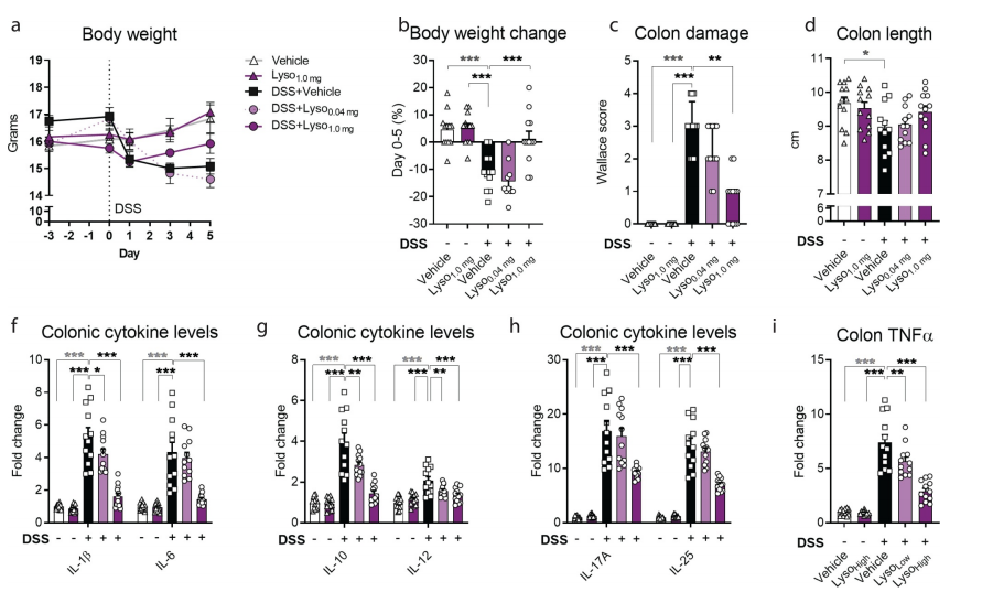 為了進(jìn)一步研究補(bǔ)充溶菌酶對(duì)腸道健康的有益效果,本文中研究者們?cè)u(píng)估了化學(xué)誘導(dǎo)(DSS誘導(dǎo))的輕度結(jié)腸炎中的結(jié)腸損傷。設(shè)置了兩種劑量(1.0mg和0.4mg)的溶菌酶。在體重方面,發(fā)現(xiàn)接受1.0mg溶菌酶在對(duì)DSS誘導(dǎo)的小鼠的有一定的保護(hù)作用(圖3a-b),而0.04mg劑量的溶菌酶雖然缺乏保護(hù)作用,但是仍能抑制腸道炎癥(圖3c-h)。研究者還在所有測(cè)量數(shù)據(jù)中觀察到一個(gè)高度一致的劑量依賴性趨勢(shì)(圖3a-h)。與對(duì)照組小鼠相比,1.0mg溶菌酶沒有引起結(jié)腸損傷或細(xì)胞因子水平的可測(cè)量變化,因此表明溶菌酶不影響健康小鼠的免疫穩(wěn)態(tài)(圖3c-h)。