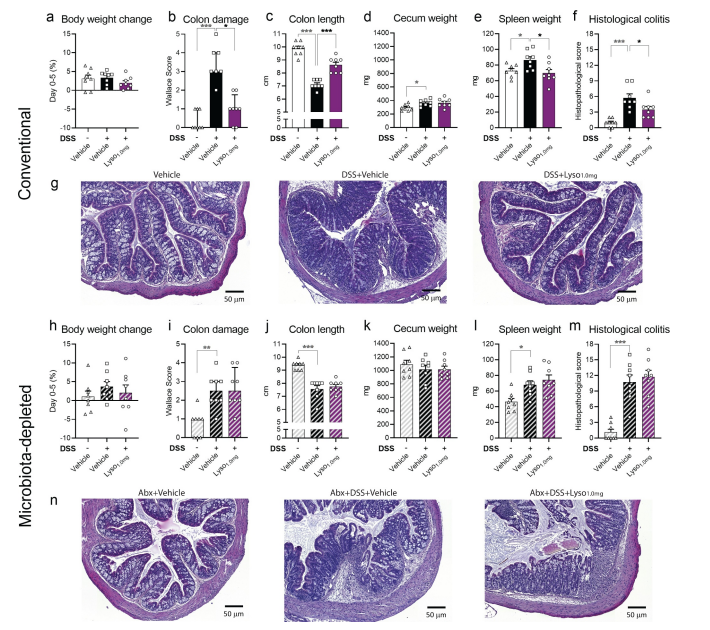 為了進(jìn)一步評(píng)估這種溶菌酶對(duì)腸道炎癥的療效,研究者接下來對(duì)DSS誘導(dǎo)的常規(guī)小鼠或微生物耗盡的BALB/c小鼠補(bǔ)充溶菌酶。