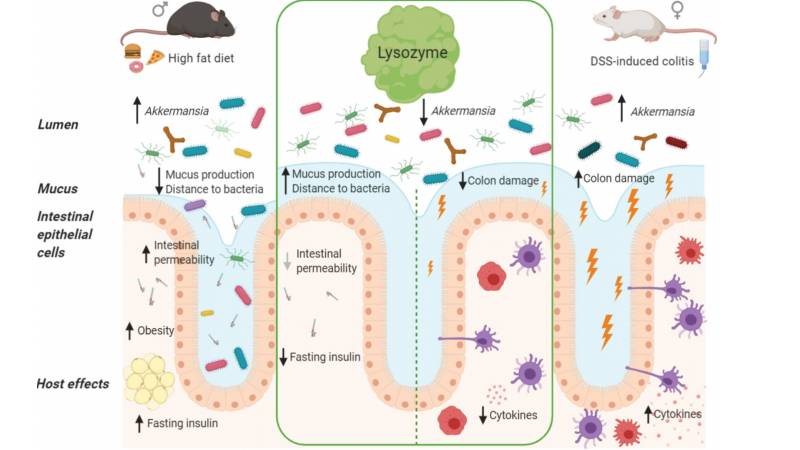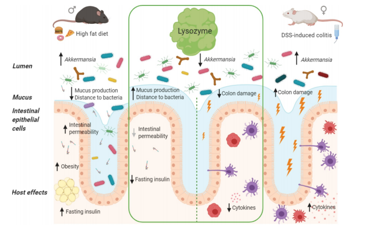 研究發(fā)現(xiàn)溶菌酶可劑量依賴性地減輕DSS刺激小鼠的腸道炎癥,可通過黏液的產(chǎn)生抑制HFD誘導(dǎo)的微生物群侵犯或易位,并可預(yù)防空腹高胰島素血癥。同時(shí)研究也發(fā)現(xiàn)溶菌酶保護(hù)腸道健康依賴于一些復(fù)雜的腸道菌群。