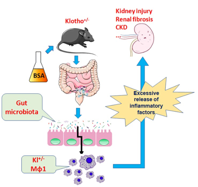 圖1.BSA通過腸道菌群-免疫軸加重klothod缺陷小鼠巨噬細(xì)胞M1激活和腎臟損傷。