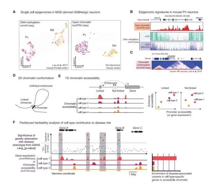 盡管全基因組關(guān)聯(lián)研究(GWASs)已經(jīng)確定了一些神經(jīng)和精神疾病的風(fēng)險(xiǎn)位點(diǎn),但每種疾病中特定腦細(xì)胞類(lèi)型的脆弱性在很大程度上仍是未知的。通過(guò)細(xì)胞類(lèi)型特異性轉(zhuǎn)錄組或表觀(guān)基因組的遺傳分析可以識(shí)別活躍基因在GWAS風(fēng)險(xiǎn)位點(diǎn)附近富集的細(xì)胞類(lèi)型,表明其在疾病中可能具有直接或間接的作用(圖3F)。