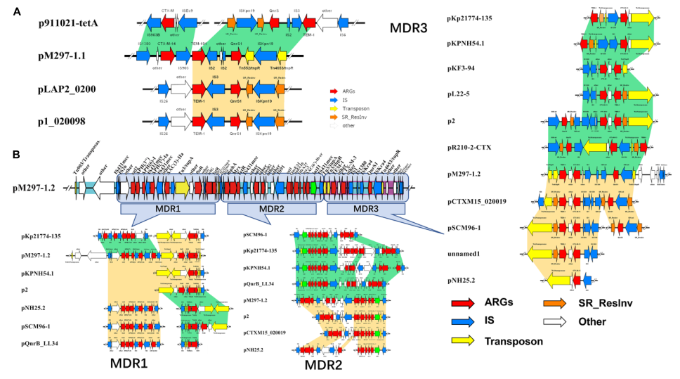 (A)pM297-1.1與其同源質(zhì)粒MDR區(qū)域特性及比較;(B)pM297-1.2與其同源質(zhì)粒MDR區(qū)域特性及比較。